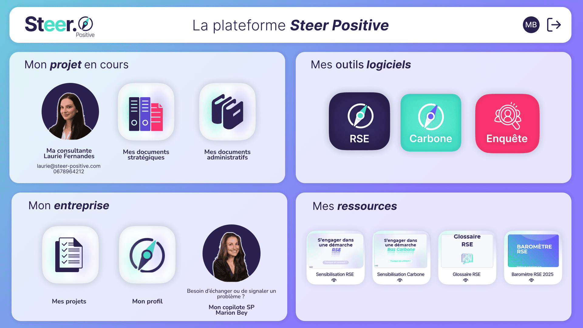 Depuis une plateforme unique, centralisez vos projets, accédez à vos contenus et documents, collaborez avec vos équipes et consultants, et pilotez vos missions RSE en toute simplicité.