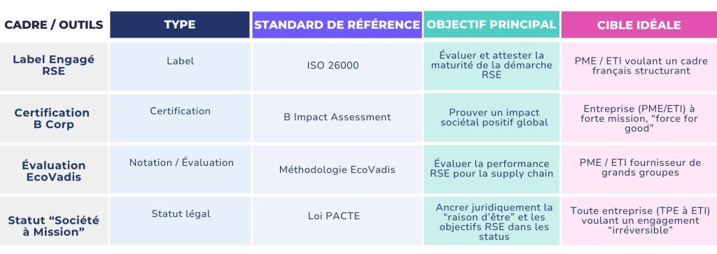 Face à la diversité des labels, certifications et statuts existants, l’écosystème RSE peut rapidement sembler complexe. Pour une PME ou une ETI, le choix se concentre toutefois le plus souvent autour de quatre cadres majeurs, chacun répondant à un objectif spécifique : structuration interne, reconnaissance externe, exigences clients ou engagement statutaire.