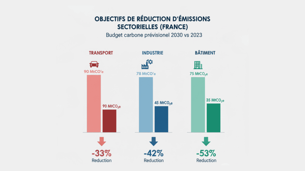 Les secteurs les plus émetteurs seront particulièrement concernés, avec des budgets carbone sectoriels prévisionnels déjà esquissés :